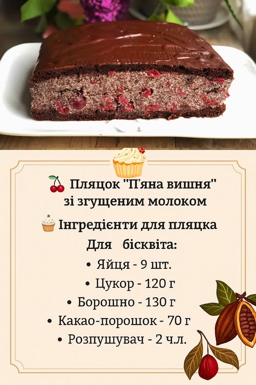 Пляцок “П’яна вишня” зі згущеним молоком — покроковий рецепт