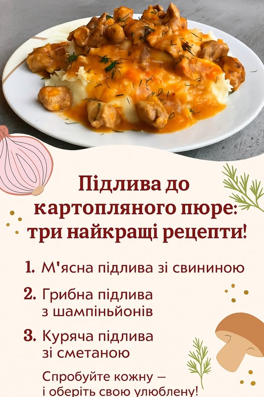 Ароматна підлива — це саме те, що перетворює звичайне картопляне пюре на повноцінну домашню страву. Пропонуємо три перевірені варіанти — з м’ясом, грибами та куркою зі сметаною.