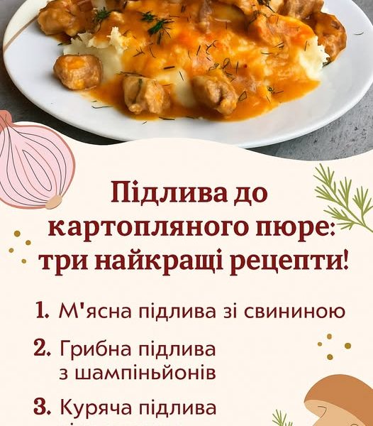 Ароматна підлива — це саме те, що перетворює звичайне картопляне пюре на повноцінну домашню страву. Пропонуємо три перевірені варіанти — з м’ясом, грибами та куркою […]