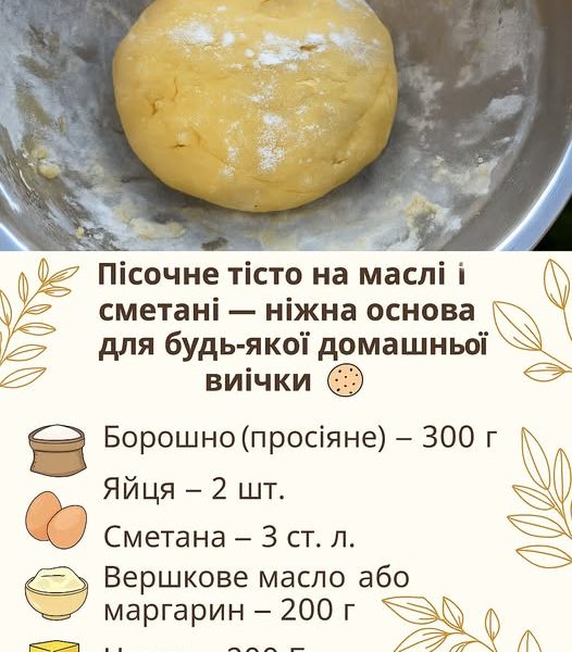 Інгредієнти: Борошно (просіяне) — 300 г Яйця — 2 шт. Сметана — 3 ст. л. Вершкове масло або маргарин — 200 г Цукор — 200 […]