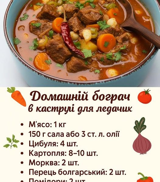 М’ясо: 1 кг (Яловичина або свинина, крупні кубики 3-4 см).