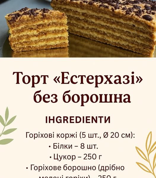 Ніжний горіховий торт на білкових коржах із заварним кремом. Інгредієнти Горіхові коржі (5 шт., Ø 20 см): Білки — 8 шт. Цукор — 250 г […]