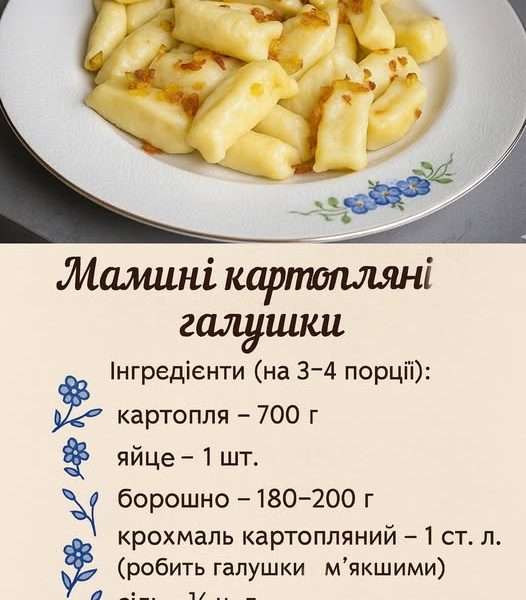 Інгредієнти (на 3–4 порції): Для галушок: картопля — 700 г яйце — 1 шт. борошно — 180–200 г (регулюйте за консистенцією, не забивайте тісто) крохмаль […]