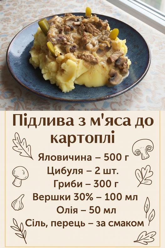 Найкраще смакує така підлива з класичним картопляним пюре, але також пасує до гречки, макаронів або домашніх клусок.