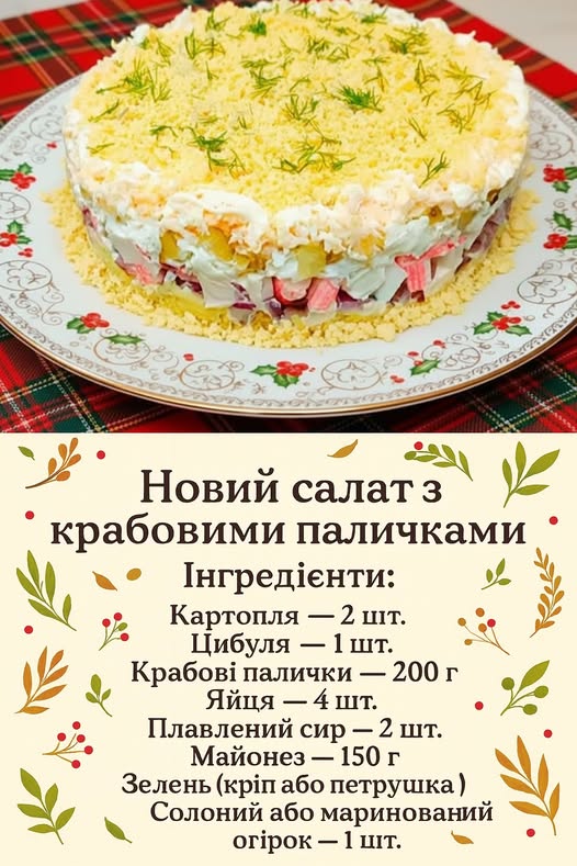 Крабові палички наріжте кубиком і викладіть наступним шаром.