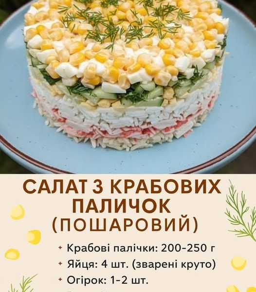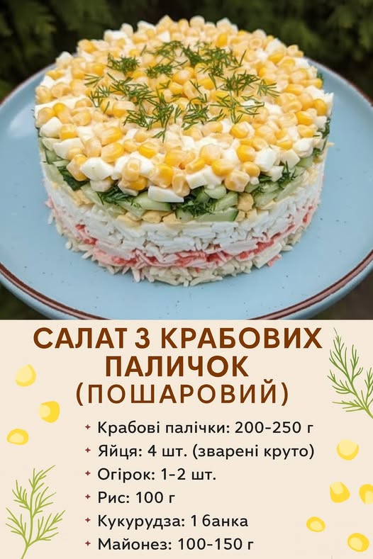 Фініш: Зверху щедро прикрасити консервованою кукурудзою та гілочками свіжого кропу.