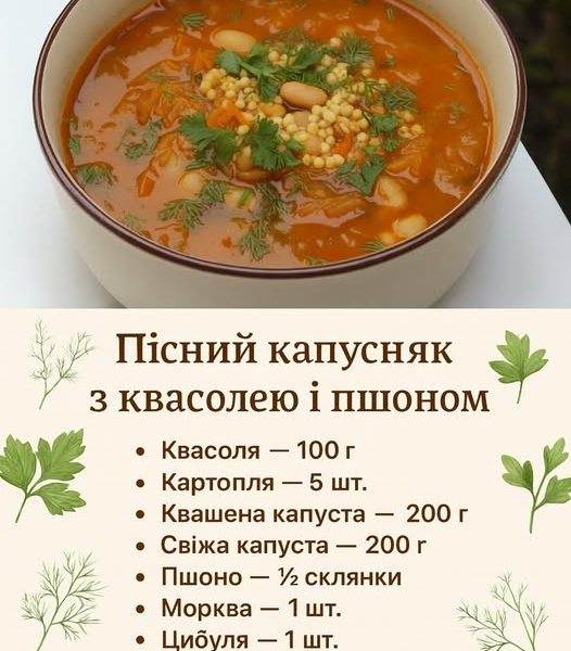 Інгредієнти 5 літрів: Квасоля — 100 г Картопля — 5 шт. Квашена капуста — 200 г свіжа капуста — 200 г Пшоно — ½ склянки […]