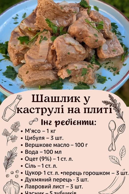 Шашлик у каструлі подавайте гарячим — із картопляним пюре, овочами чи свіжим хлібом.