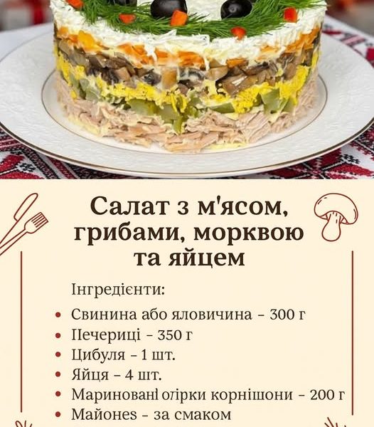 Цей салат чудово тримає форму, виглядає ефектно на столі та має збалансований смак. Особливо сподобається любителям м’ясних і грибних салатів.