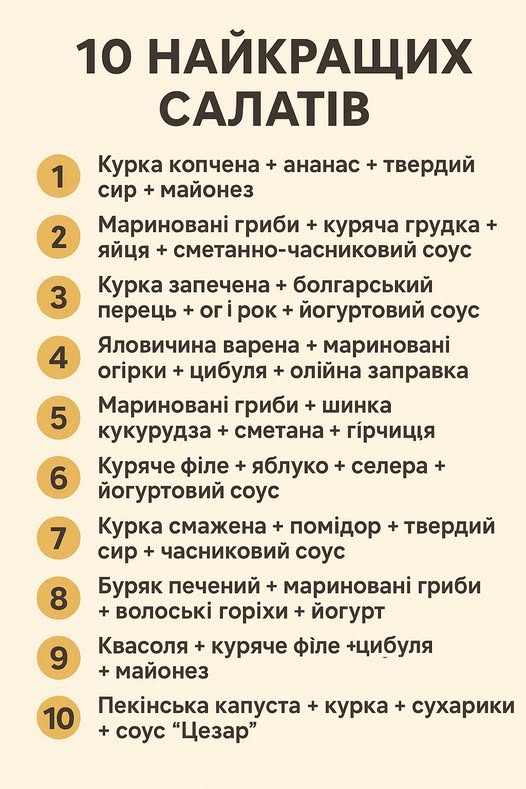 10 найкращих салатів — короткі рецепти з точними кількостями