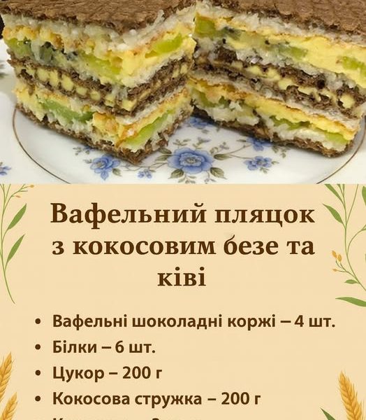 Святковий десерт із хрустких вафельних коржів, кокосових безе-шарів і ніжного сметанно-заварного крему. Свіжість додають тонкі скибочки ківі — вони чудово балансують солодкість і роблять пляцок […]