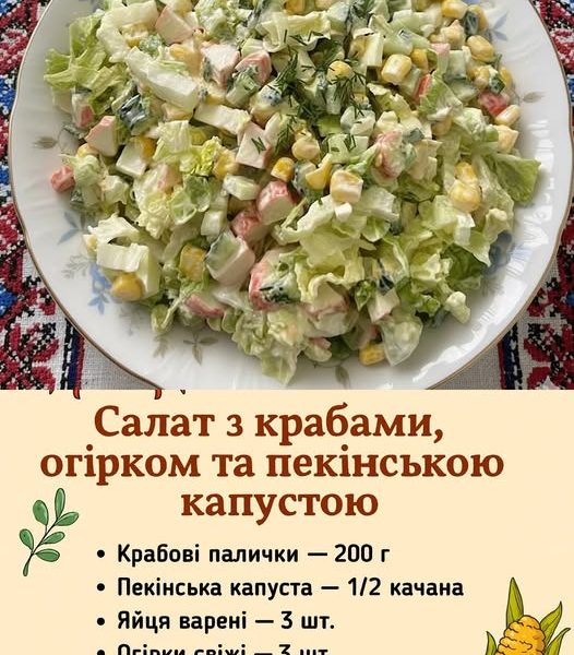 Інгредієнти: Крабові палички — 200 г Пекінська капуста — 1/2 качана Яйця варені — 3 шт. Огірки свіжі — 3 шт. Зелена цибуля — 3 […]