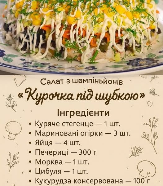 Салат з курки та шампіньйонів “Курочка під шубкою”